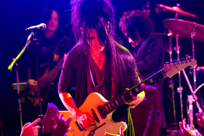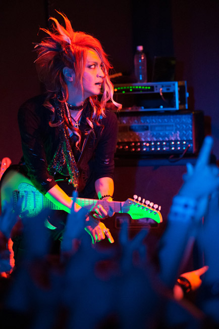 As if he was finally finished warming up, MORRIE took off his jacket before playing COSMOS BLACKNESS and Golden Game. MORRIE interacted with HIRO and Shinobu at the front of the stage and the crowd responded by putting their hands up and dancing along. HIRO showed off his tapping skills during the solo to the enthusiastic crowd. To heat things up even more, MORRIE unbuttoned his shirt and sent the crowd into a craze. I also noticed the stage staff headbanging on the side of the stage. You know a band is good when their staff, who has probably listened to these songs countless times, enjoy the songs as much as the rest of the crowd.