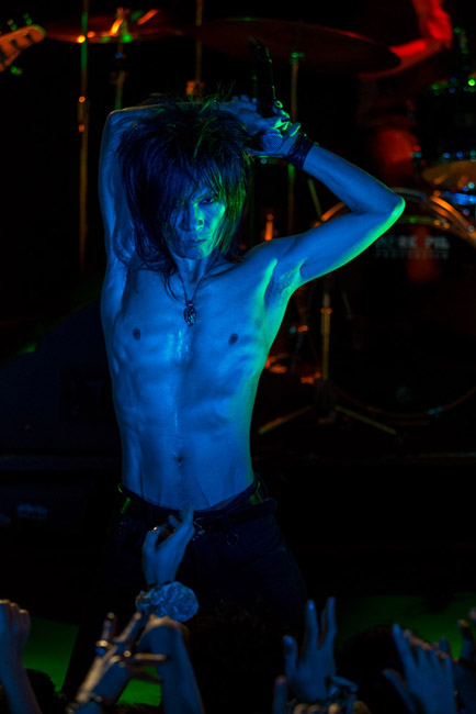 The crowd quieted down and the band waited for the SE to finish before Shinobu started playing the clean melodic guitar intro of Shinkuu, incidentally also the first track on the album “INFERNO” (2010). MORRIE sets the atmosphere of the live with his hauntingly beautiful vocals on the short song. Following right after is the familiar transition into Cluster, the 2nd track on “INFERNO”. The song started with a grungy guitar rhythm that got everyone’s head nodding along as MORRIE sang the rock number with confident sounding vocals. The song showcased a bit from each of the instrumental parts, first with HIRO‘s roaring guitar solo which was quickly joined by Shinobu, followed by a short drum solo by Sasabuchi and Hitoki‘s funky bass line. Then it switched from a slight madness to a quiet section with clean strumming before returning to a heavier sound.