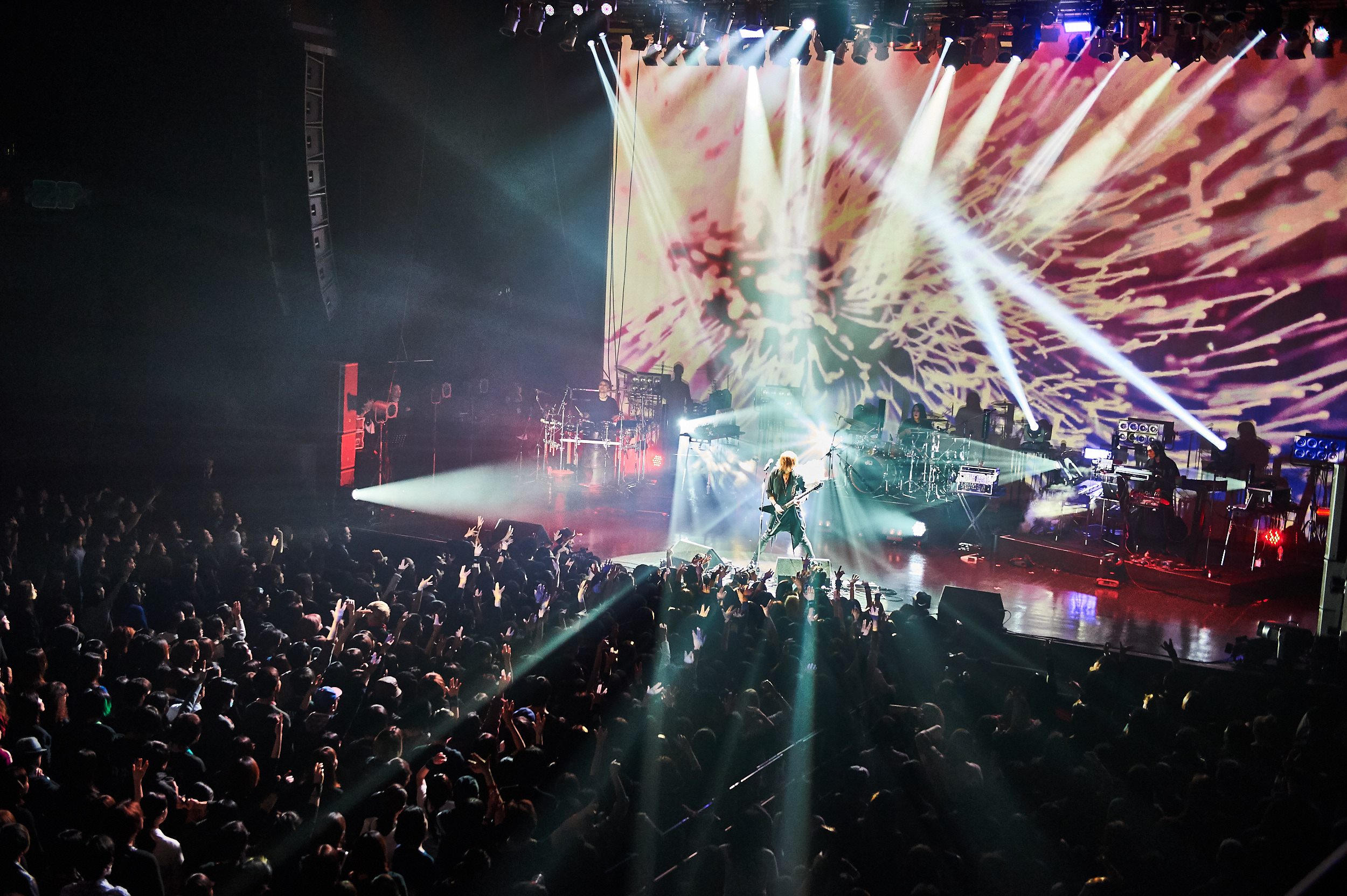 Ambient music filled the venue to a sold out crowd, with flashing white lights accompanying the music and a graphical video playing in the back. The members appeared on the dark stage to an excited crowd cheering their names. The first song, “IRA” focuses heavily on a thundering rhythm and SUGIZO’s guitar reverberating throughout the venue. A short MC came after the first song, with SUGIZO first apologizing to the fans for having them wait outside in the cold for thirty minutes more than expected, and him introducing the special make-up of the show that night. Following up, he said, “It’s cold outside, but you’re gonna get a hot and excited psychedelic “super SUGIZO” here, non-stop. Today, let all of us ascend together to a “‘SUGIZO kind of universe’. Let’s all go together, alright?” He then introduced the next song to be a 20-year old track, “THE CAGE,” from his first album released in 1997.