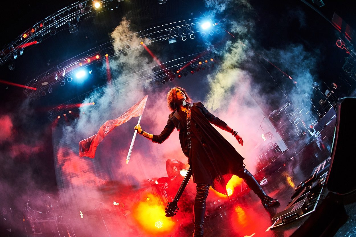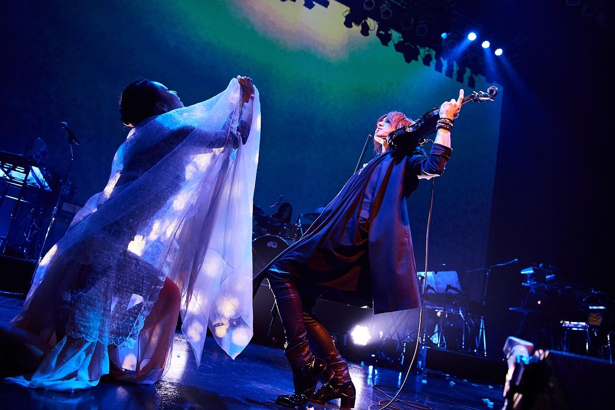 Things got heated up again with sparks flying from the drums on far stage right and flashing white lights for “Decaying,” which features a prominent drum part. Then the drums got even faster, heavier and more powerful for “禊”, this time featuring Japanese instrumental elements as well as the percussionist on drums center stage once again. After this, bright lights flooded the venue, with SUGIZO center stage showing off not only his guitar skills, but his unrivaled presence and charisma as one of the leading guitarists in the scene. Fans burst into loud cheer and followed suit when SUGIZO had his hands up in his signature Vulcan salute and announced “Last Song!” The main set with the indeed psychedelic and upbeat song, “TELL ME WHY?” Fans waved their hands and danced in unbelievable unison as SUGIZO ran around the stage. SUGIZO wrapped up part one of the night, saying “Thank you, Tokyo! Thank you, everyone, you were all great. It was amazing.” before introducing all the members performing that night, and then gathering center stage to bow together.
