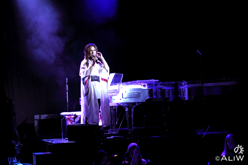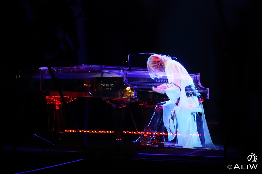 The hologram appeared almost discreetly from the feet up to the excited and hushed whispers of those in attendance. Once the full image appeared, the apparition of YOSHIKI announced the commencement of the night’s event beginning with Art of Life. In a surreal and ethereal show, the image sat at the waiting piano and began playing the familiar song.